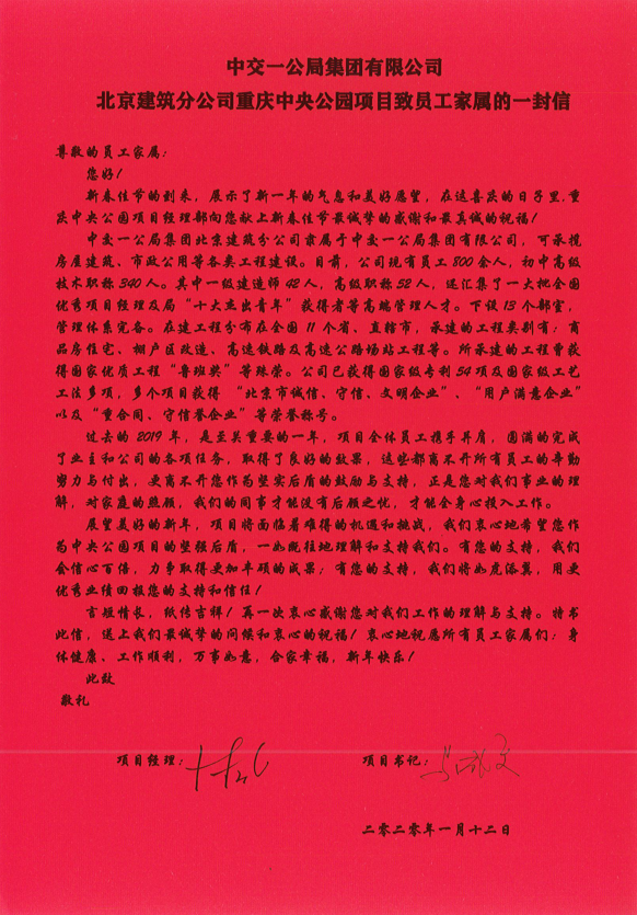 薄薄的一封信,包含着项目部的温情,包含着项目爱的传递,表示对员工家人的感谢,表示对项目员工一年来工作的认可,新春佳节将至,旧去新来,鞭炮声声迎新年,妙联横生贴门边,欢笑处处传入耳,美味佳肴餐桌前。