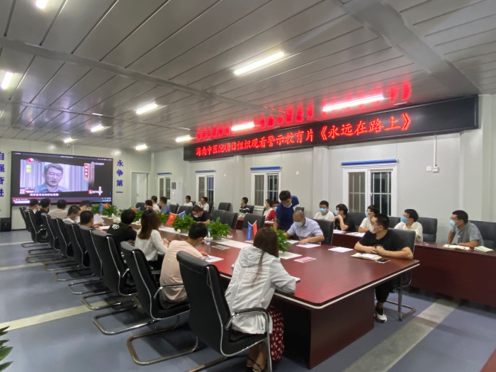 为切实提高党员干部的廉洁自律底线共识和思想觉悟,3月9日,由项目书记张显楼带领全体党员干部及全体职工观看警示教育片《永远在路上》。