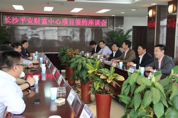 4月16日,长沙平安财富中心项目签约座谈会在中交一公局机关二楼会议室举行。长沙市芙蓉区区长彭娟、长沙市芙蓉区招商局局长谢小红、北京建筑分公司总经理闫广东、平安信托物业投资部总经理崔丽斌、湖南宏通广厦房地产开发有限公司总经理肖共田出席了签约座谈会。