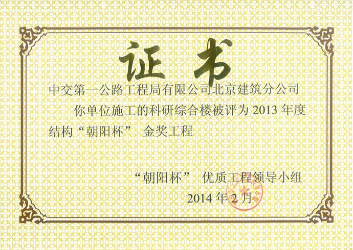 近日,由局自行投资建设的局科研综合楼项目喜获2013年度北京市“结构长城杯”金杯及朝阳区“朝阳杯”结构金质奖。