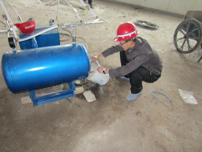 由于施工过程中雨水渗透到保温层中,使保温层积水,因此,项目书记张长青根据相关资料和多年的工作经验拟定本次实施方案。试验段设置在Ⅲ段3-1~3-7/C ~K轴12层,采用直径12mm钻头在屋面楼板下方打6个孔(孔的数量视漏水范围而定)并与一台2BVA系列的水环真空泵链接;同时,将门窗打开,加速空气流通;待存水全部放出且无渗漏时,用1:2水泥砂浆渗入水泥重量8%~12%的膨胀剂,堵实孔眼。