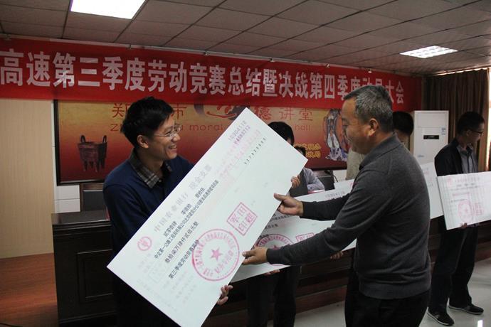 10月17日下午3时,在BT项目公司二楼会议室隆重召开了登汝高速第三季度劳动竞赛总结暨决战第四季度动员大会。在此次竞赛中,登汝高速房建项目部喜获第三季度劳动竞赛奖励37.42万元,另外获得如意公司额外奖金10万元,共计47.42万元。