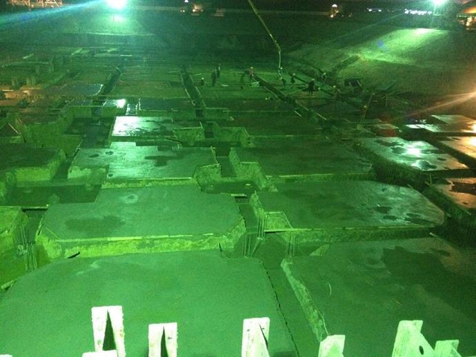 受降雨的影响,苏地2013-G-98号地块项目施工进度受阻。由于降雨量较大,基槽施工段部分工序不得已停止施工或施工暂缓,致使工期延后,若继续按照正常施工进行,将无法完成预定目标。为赶进度缩短工期,项目全体员工在项目经理刘向军的带领下发扬优良作风,日夜加班加点的工作。经过全体员工的不懈努力,项目现已完成一、二、三、六等施工段垫层砼浇筑,其余各段施工也正有序进行,确保后续工作形成流水施工,施工进度得到了业主的肯定。在项目全体员工卯足干劲、挑灯夜战、不懈努力下施工进度以及质量得以保证,为确保于春节前夕完成±0.000施工面的标准增加了筹码。