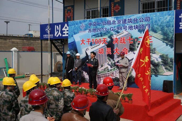 项目经理刘向军通报了苏地2013-G-98号地块项目前期工程进度,并宣读了关于开展“大干一百天 决战七.二三”的活动方案。刘经理在动员会上指出,项目部要以管理科学化、操作规范化、施工标准化为准则促进施工进度稳步推进,确保安全、质量全面管控,项目每一个员工以新的起点,积极投入到不同的岗位中去。以这次劳动竞赛为契机,真抓实干,昂扬斗志,赛出风采。