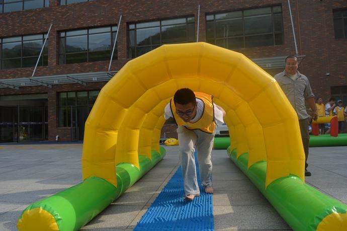 在教练的统筹安排下,参加人员被随机分为四支队伍,通过集体讨论,每队选出一名队长和秘书,确定了各自的队名、队服、队旗、队歌、logo和口号。在训练过程中,四支队伍展开了激烈角逐,相继进行了枕头大战、毛毛虫折返跑、指压板障碍赛、撕名牌大战、拔河、神来之笔和超音速翻纸牌等项目的比赛。每个项目都具有一定困难和挑战性,大家忘记了年龄、忘记了职位,全身心投入到训练活动中,体验团队活力,感受队员友情,融洽团队合作精神。所有队员在各自团队的共同努力下,表现出了良好的团结协作精神和较强的个人素质,通过集体智慧与个人毅力以及团队良好的配合,出色地完成了全部拓展训练任务。