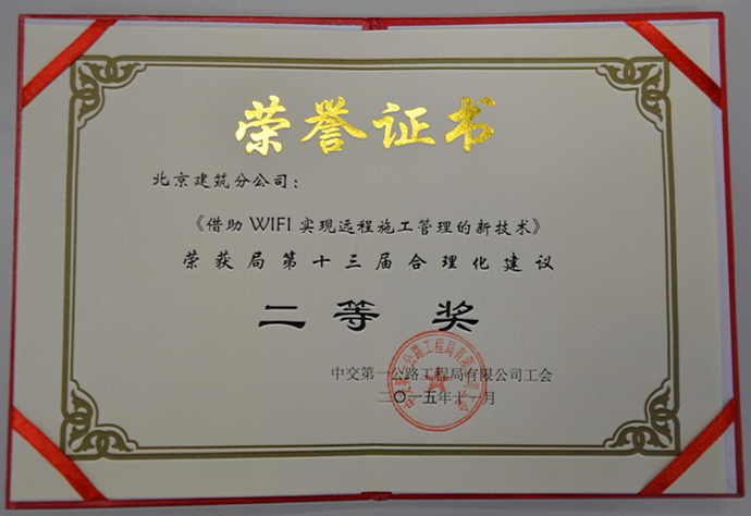 为深入开展合理化建议、技术革新群众性经济创新活动,推进品牌建设,创建精品工程,营造增收节支、职工群众广泛参与创新活动的良好氛围,11月5日-6日,局第十三届技术革新和合理化建议技术成果发布会在北京建筑分公司大会议室顺利召开。我公司发布的《借助WIFI实现远程施工管理的新技术》成果荣获局第十三届合理化建议二等奖。