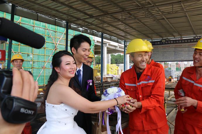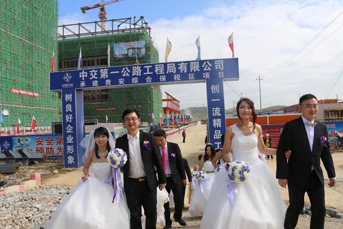 他们手挽手,肩并肩,手捧鲜花会聚贵安项目工地一线,就在这个让他们梦起航的地方,他们决定让爱传递下去,每对新人将喜糖送向项目一线工人,幸福甜蜜瞬间洒满整个施工现场。