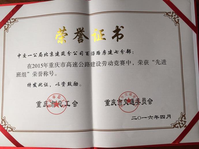 “五一”前夕,重庆市交委与重庆市总工会联合颁发了关于表彰2015年度重庆市全市交通建设领域优秀青年建设者以及高速公路建设劳动竞赛先进集体和先进个人的决定。酉沿房建项目荣获“重庆市高速公路建设劳动竞赛先进班组”荣誉;项目杨永洪、张政哲同志获得“重庆市2015年度全市交通建设领域优秀青年建设者”与“高速公路建设劳动竞赛先进个人”荣誉称号。