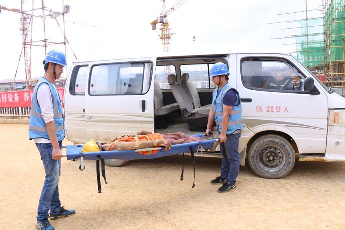 演习模拟了人员坠落后现场医护人员对伤员进行简易包扎、拨打项目紧急救援电话、用担架将伤员抬至项目救援车辆的全过程。演习人员反应迅速、救援动作精准,全程共耗时6分37秒。