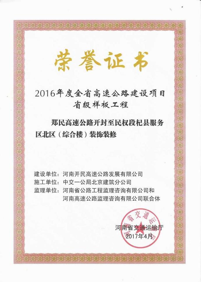 近日,公司郑民高速开封至民权段杞县服务区北区(综合楼)装饰装修工程喜获河南省“2016年全省高速公路建设项目省级样板工程”荣誉。