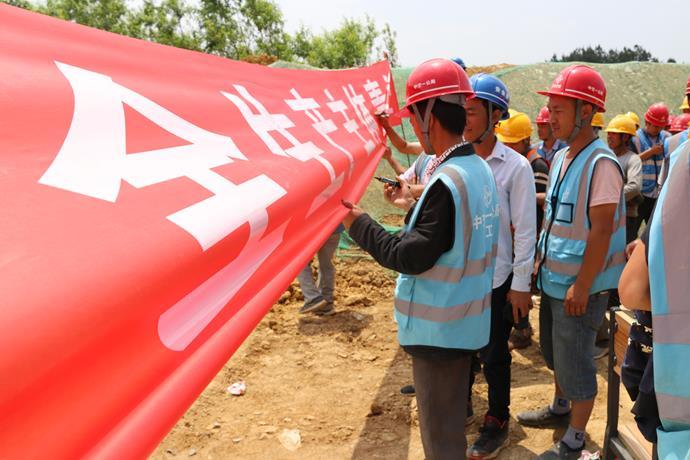 6月2日,双龙马寨新城(安置点)项目部举行2017年“安全生产月”启动仪式,项目部全体职工、监理单位人员、各工区工人共计100余人参加了仪式,全体人员庄严宣誓并在安全月横幅上签名将启动仪式推向高潮。(倪露)