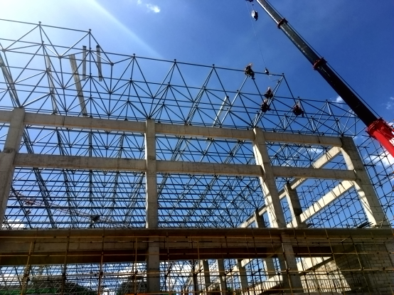 体育馆屋面为场区内规模最大的一个钢结构金属屋面,长88.5米、宽46.8米,总重量150余吨。架结构采用下弦多螺栓球节点支承,基本上没有焊接节点,具有造型简洁、美观、施工周期短等特点,且结构形式稳定、抗震效果好。