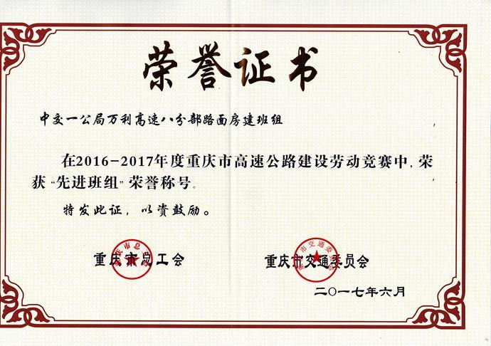 近日,万利八分部喜获重庆市2016-2017年度高速公路建设劳动竞赛活动“先进班组”荣誉,项目张政哲获得“先进个人”称号。