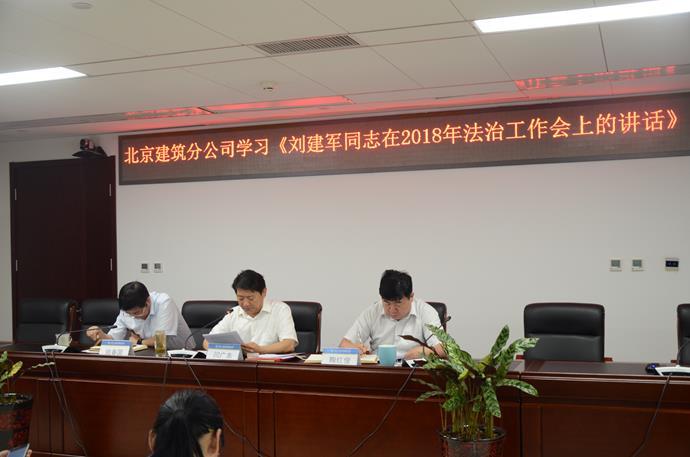 5月10日上午,由公司党委书记、执行董事闫广东主持召开北京建筑分公司学习《刘建军同志在2018年法治工作会上的讲话》。在京领导、机关全工员工在主会场,项目全体员工在视频分会场参会。