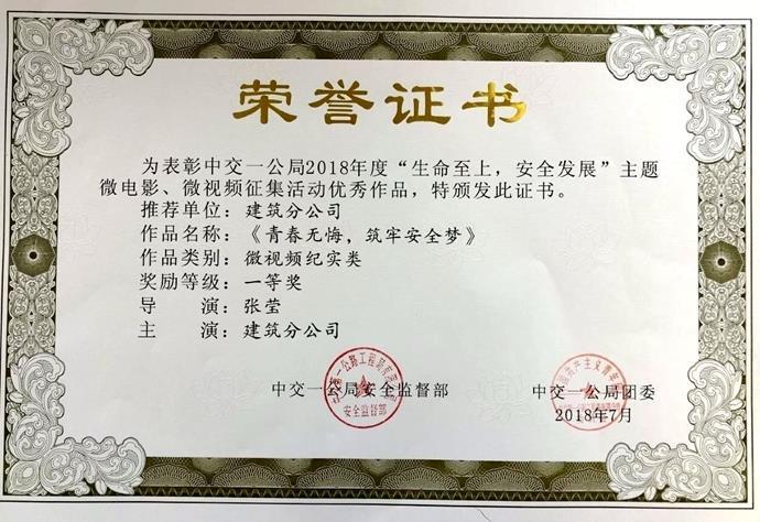 8月1日,局团委对“生命至上、安全发展”主题微电影、微视频征集活动评选结果进行通报,公司大邑二期项目参评的纪实类微视频《青春无悔,筑牢安全梦》喜获一等奖。
