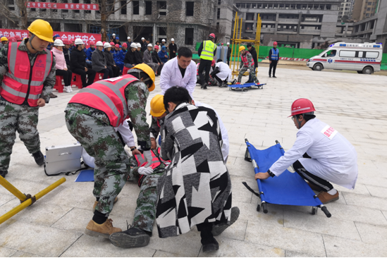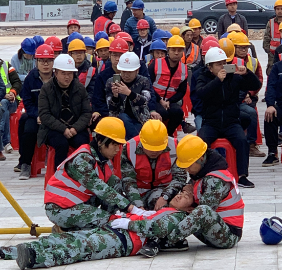 上午9点28分活动正式开始,北师大铜仁附属学校项目经理周海亮首先致欢迎词;公司党委书记、执行董事闫广东对演练做了动员讲话,并对参演人员和项目应急管理工作提出5点要求。公司副总经理杨永洪下达了演练开始的命令,随后,铜仁市人民医院医护人员对现场全体人员进行了紧急医疗救护操作演示,讲解工地临时外伤包扎和胸外心脏按压正确方法,提高伤员现场医疗成功率。
