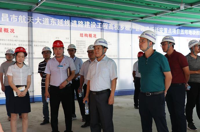 闫广东详细了解了现场工程进度和环形通道建设、场地绿化和样板间制作情况。随后,一行人前往项目驻地参观了安全体验区、安全标准展示区、项目生活区和农民工生活区等建设。