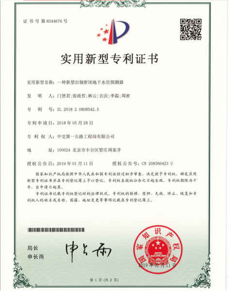 人大附中项目新型自制密闭地下水位检测器荣获国家实用新型专利证书