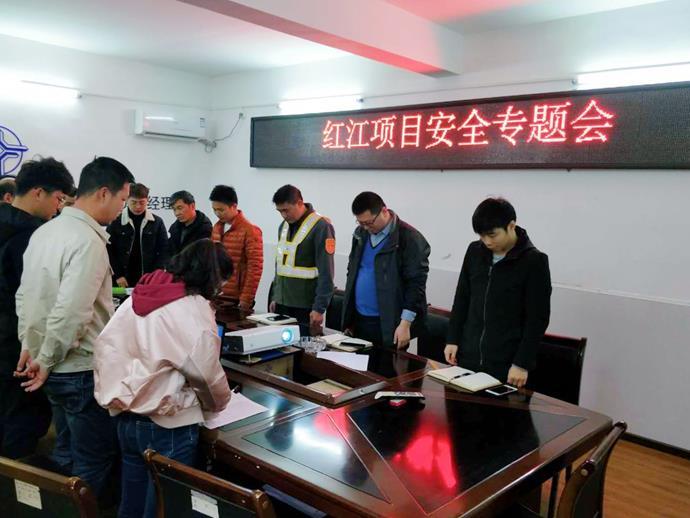 本次会议主要通报了“成都双流国际机场飞机滑行道桥项目钢筋倾倒事故”等救援进展及事故发生后的具体安排部署等相关情况。会上,项目部全体员工为逝者默哀。随后,项目副经理马晓辉就红江项目后续安全生产工作提出了具体要求。