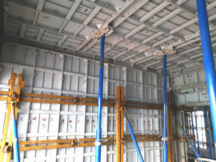 广州南沙项目,项目总建筑面积19.32万平方米,共5栋超高层高档商品住宅楼,其中6、7、8、9#楼均采用铝模+爬架的施工模式。铝合金模板体系施工周期短,相比传统木模施工体系每层可缩短2至3天,可重复使用且施工方便,在降低平均使用成本的同时提高了施工生产效率。同时铝模板拆模后,混凝土表面平整光洁,观感质量好,基本上可达到饰面及清水混凝土的要求,具备墙面免抹灰的优点,为保障工程创优,提供了保障。