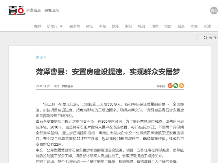 3月11日、3月13日,山东省齐鲁晚报齐鲁壹点-菏泽曹县:安置房建设提速,实现群众安居梦及菏泽市学习强国公众号-菏泽故事|山东省曹县:安置房建设提速 实现群众安居梦,重点报道了中交一公局集团有限公司曹县青石街安置房一期项目的复工复产情况。