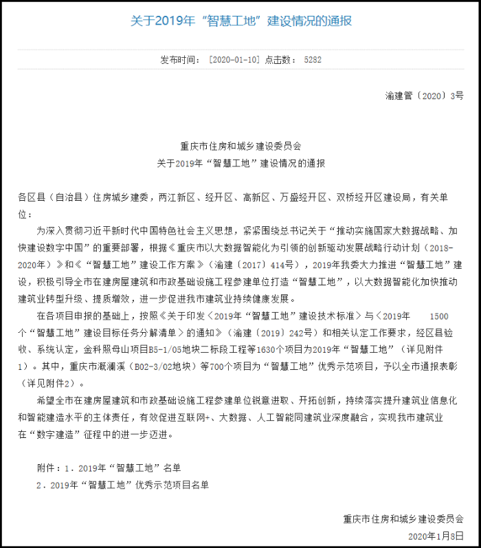 近日,重庆市住房和城乡建设委员会在官方网站上通报表彰关于2019年“智慧工地”建设情况,中交·世通大厦项目(一期)2号楼工程获得2019年“BIM智慧工地”优秀示范项目称号。