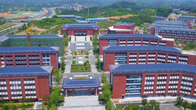 学校位于川硐教育园区,占地900亩,分两期建设。工程包含行政中心、会堂及活动中心、学术交流中心、图书馆、公共教学楼、院系教学楼、实训楼、学生食堂、学生宿舍、教师宿舍等70栋单体建筑以及市政工程。
