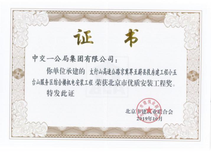 近日,由北京市建筑业联合会获悉,在2019年优质安装工程评审中,公司京蔚高速小五台山服务区综合楼机电安装工程喜获“北京市优质安装工程奖”。