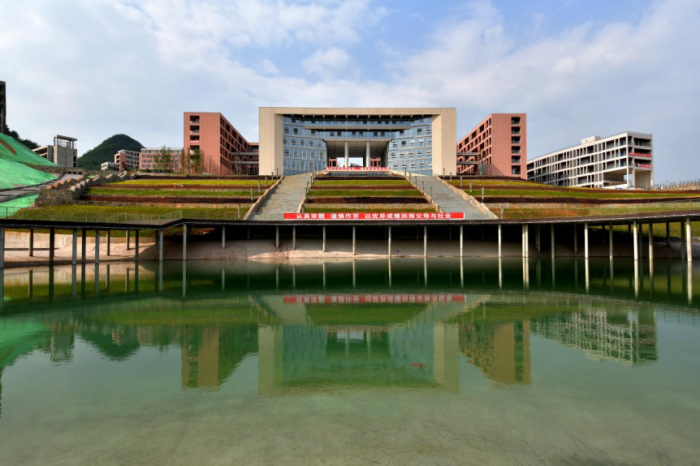 学院山背峻茂,面南而坐,建筑面积32万平方米,建筑功能齐全、设备先进,有图书馆、体育馆、大学生活动中心、田径运动场、千人大会堂等,项目建设秉持“山水田园聚落,健康生活学府”理念依山而建,保持原有的生态景观,建筑错落有致、环境自然幽雅,充分发挥场地的生态环境优势和特色人文景观资源,建构合理的校园格局,并依山就势,造就特色鲜明的山地校园。(罗文浩 徐亮)