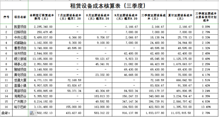 为更有效的落实集团公司“两降两控一治一快”和公司“目标管理、节点管控”的管理思路、提高项目工期履约意识、加强设备成本管控、控制高设备占用费,物设部对项目外租设备从前期策划——过程核算通报——完工成本测定等方面推行“设备全生命周期成本管理”。制定“设备租赁成本核算表”和“垂直运输机械单位成本测定表”对项目设备租赁成本按月按形象进度进度进行核算,与前期策划中设备全预算总成本形成绝对值和相对值的比较,并实行季度通报机制,对项目租赁延期成本进行预警通报,并纳入月度对标。
