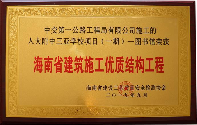1月7日,建筑分公司人大附中三亚学校项目图书馆荣获海南省2019年(9月)度建筑施工优质结构工程奖。“海南省建筑施工优质结构工程奖”是海南省建筑结构工程施工质量最高荣誉奖,由海南省建设工程质量安全检测协会具体组织评审,评定内容包括工程施工过程的管理工作质量、建材产品质量、施工操作质量、工程实体质量和环境质量。