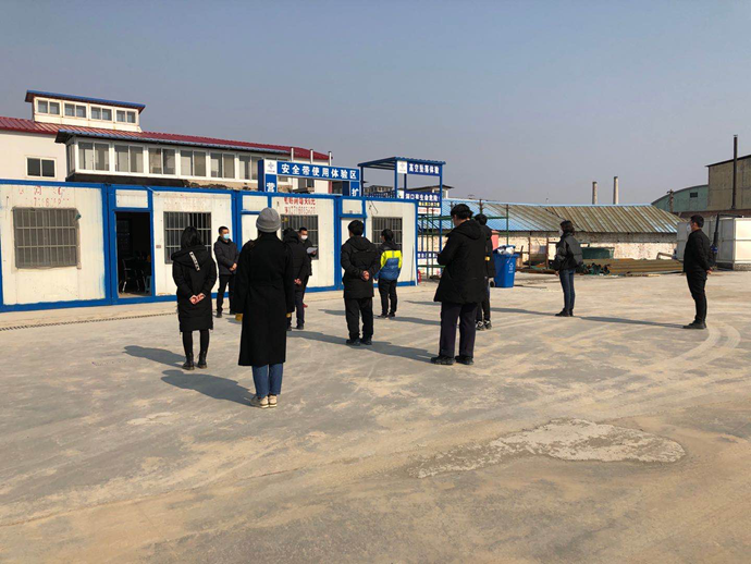 返岗第一天,项目部就疫情防控工作召开全体职工大会,为每位员工宣贯项目管理措施,五大法宝不能少:口罩、隔离、测温、消毒、通风,每人发口罩、进京人员隔离14天、每日测温登记、早晚消毒2次、长通风保持空气畅通。成立以项目书记周海亮为组长的防疫小组,每日开展“六查”,查体温、查清洁、查通风、查消毒、查卫生、查身体。