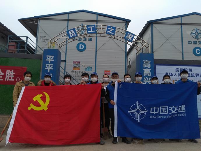 最后,在这特别的时刻,我们在工人生活区门口拍照留念,亮出旗帜,党旗和中国交建的旗帜在重庆中央公园项目“抗疫情,促复工”的一线的战场上发光发亮!(陈其)