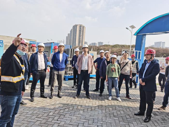 考察组首先参观了售楼中心、样板间等地,随后深入施工现场对现场的安全体验区、屋面作业区、爬架、装配式+铝模施工工艺等进行了实地考察。