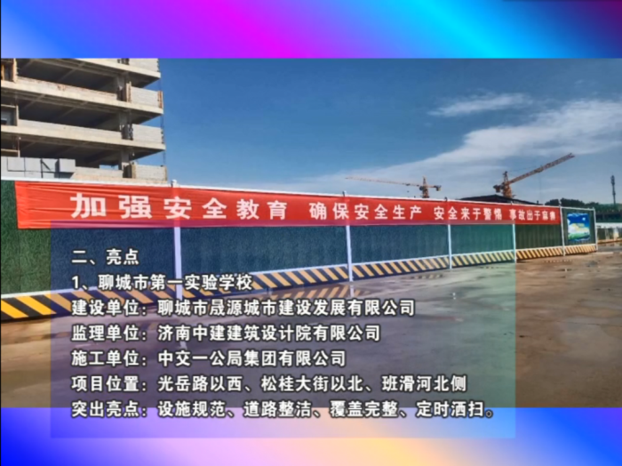 11月7日,聊城市东昌广播电视台《东昌新闻》栏目对东昌府区住建局扬尘治理办公室关于施工现场扬尘治理情况进行了报道。报道指出聊城市第一实验学校项目设施规范、道路整洁、覆盖完整、定时洒扫,并提出表扬。