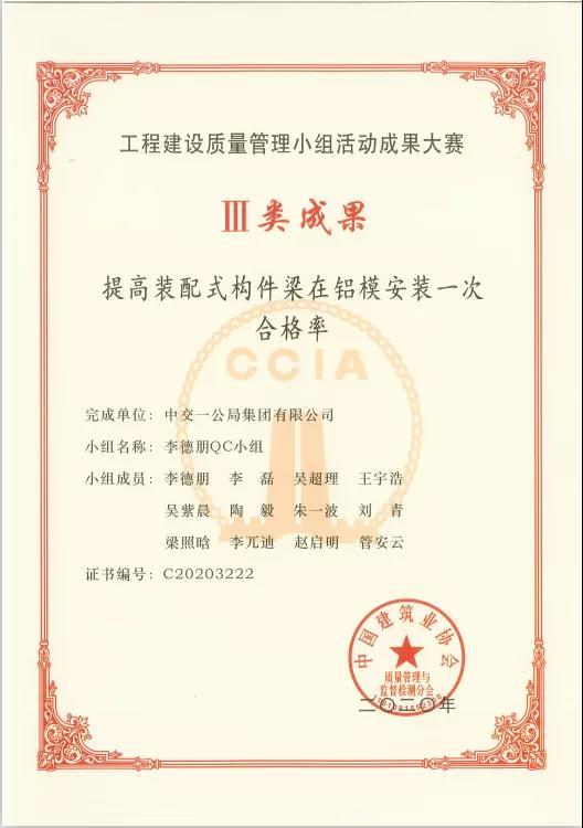 近日,从中国建筑业协会传来喜讯,重庆世通大厦项目QC成果——“提高装配式构件梁在铝模安装一次合格率”在2020年工程建设质量管理小组活动成果评审中得到行业专家和同仁的肯定,获评为Ⅲ类成果。