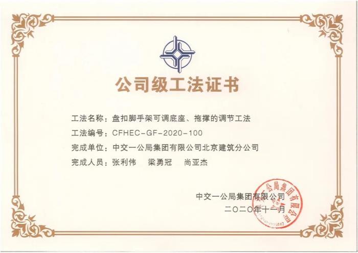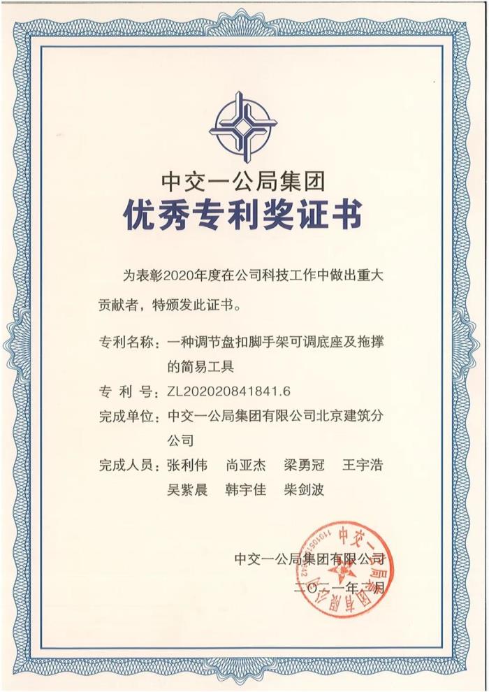 哈尔巴岭项目此项专利成果大大提高了盘扣式脚手架安拆效率,荣获一公局集团优秀专利奖和局级工法。
