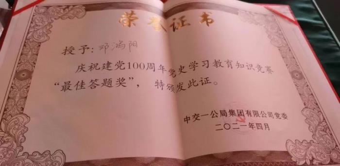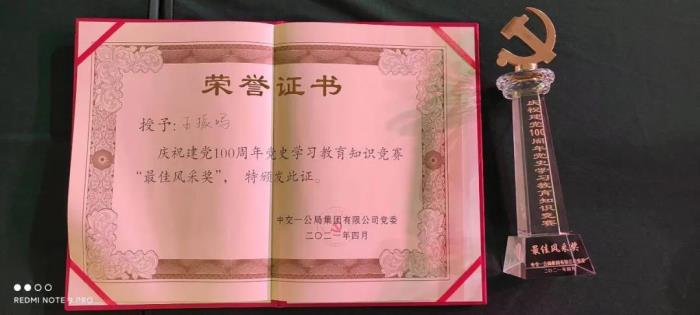 4月25日,在北京举办的“恰百年风华正茂 启新程青春奋进”建党100周年党史学习教育知识竞赛中,公司党委代表队在8支代表队中脱颖而出,勇夺党史知识大赛第一名,其队员王振鸣同志获得“最佳风采奖”、邓鸿阳同志获得"最佳答题奖"。