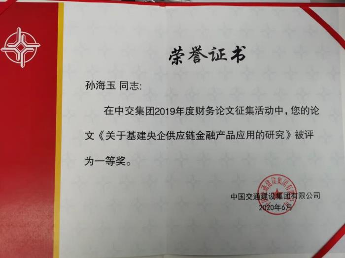 自2019年以来,集团公司已连续两年开展了财务决算先进评选活动。截止目前,公司已获得1项“财务决算先进单位”集体荣誉,3项“金融业务先进个人”荣誉与2项“中交集团优秀论文一等奖”。(赵芳)