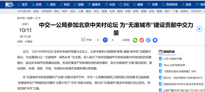 新华网报道:公司参加北京中关村论坛 为“无废城市”建设贡献中交力量