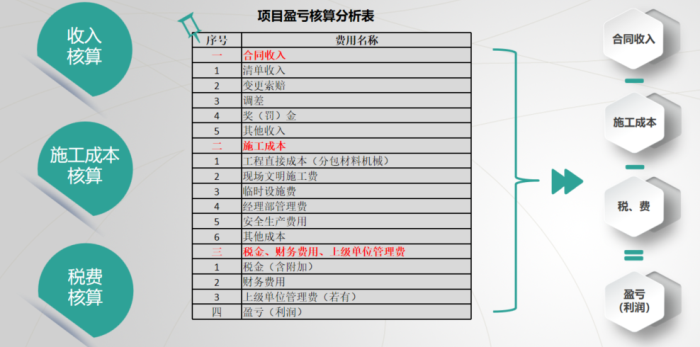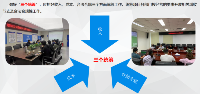 进场初期要集中精力开展“两算一核”工作,即施工预算、施工图预算及清单复核工作;过程中一要做好“三精细一监控”,即农民工实名制资料收集精细化管理、“工效”统计与分析精细化管理、成本测算精细化管理,及按方案施工的成本监控工作,确保目标成本可控并及时纠偏。二要做好根据竣工结算要求(预算)反推的资料闭合清单,及时签字确认及时闭合;同时进场正常施工后对量及时上传补充协议、完工前对量确保配合各部门完善资料并及时归集成本。三要及时统筹各部门做好资料组卷及归档工作;完工时要及时完成最终组卷工作,再次查漏补缺及时上报竣工结算,确保完成“保收增收”工作并进行最终盈亏分析,完成总结工作。同时抓好收入、成本、合法合规三个方面统筹工作,统筹项目各部门按经营要求开展相关增收节支及合法合规性工作,保证各项工作有序进行“不跑偏”。