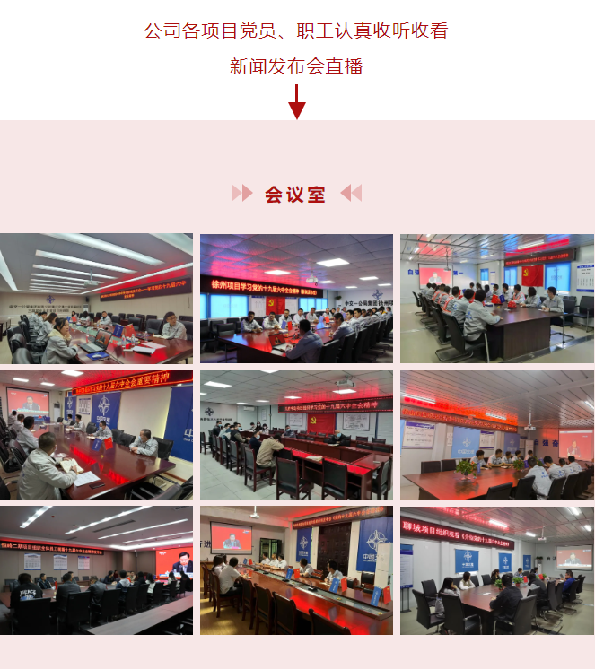 11月8日至11日,中国共产党第十九届中央委员会第六次全体会议在京举行,12日,中共中央举行新闻发布会,介绍党的十九届六中全会精神。公司党委组织所属党组织在安排好生产经营的前提下,利用广播、电视、互联网、移动设备等多种形式与渠道,收听收看新闻发布会实况直播。公司总部、各项目部及工程现场,广大党员、职工认真聆听党的十九届六中全会精神,倍加感慨、倍感振奋。