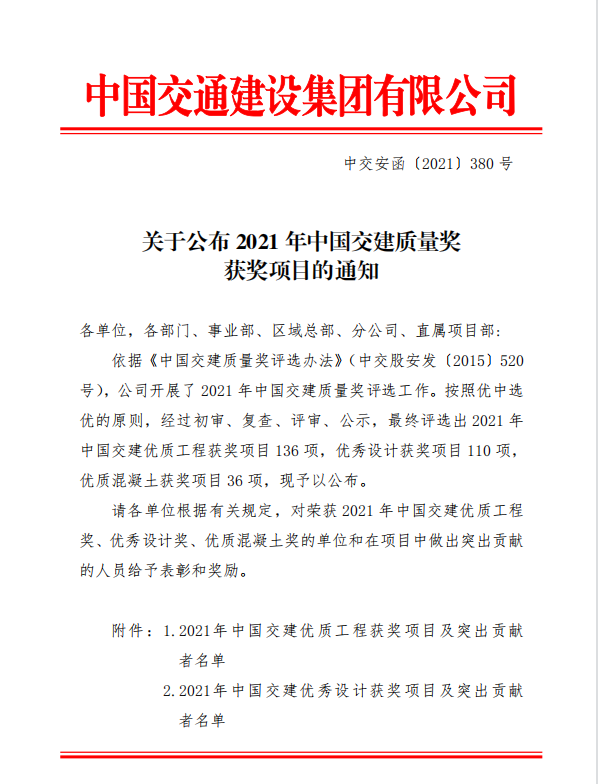 近日,在中国交建集团发布的“2021年中国交建质量奖获奖项目的通知”中,公司4项工程榜上有名(2项主申报,2项参建),获奖数量占整个中交集团房建类优质工程奖数量比例的25%,创下公司优质工程奖项历年新高。