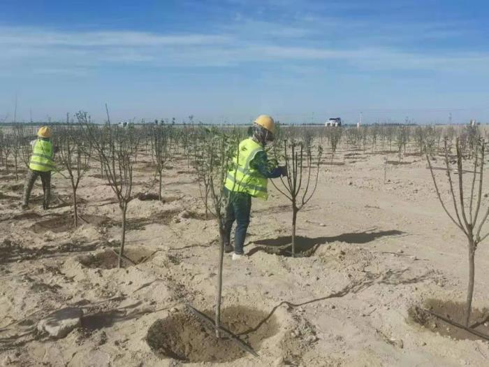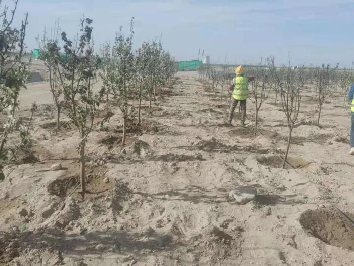 当前正是哈密植树绿化的黄金时期,项目抢抓时机,及时开展植树绿化。种植松树、马兰花、红景天、金叶榆、杏树、苹果树、核桃树、沙枣树等耐严寒、酷暑、成活率高、观赏性强的树种。鉴于当地干旱酷暑气候,项目采用了滴管技术,为树木定时灌溉,提高了存活率。