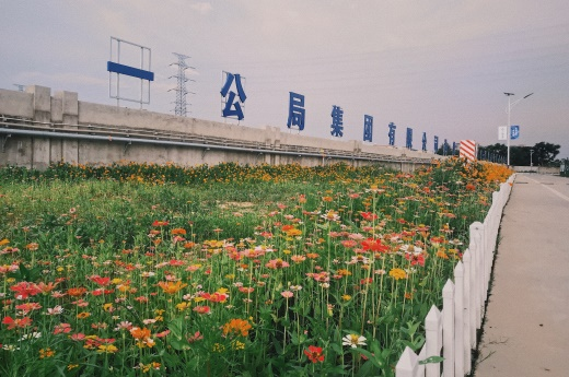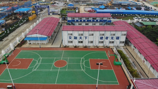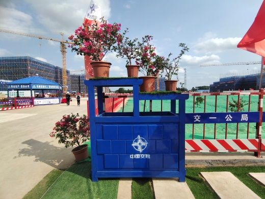 通往项目部的硬化道路两旁,铺上了草皮,栽种了树木,种植了鲜花,进入宽敞的项目部办公区,迎风飘扬的旗帜下,办公楼的楼顶凸显的LOGO,生活区宽敞的篮球场,蓝白相间的办公区前,青草依依,花团锦簇,一片绿意盎然,在绿意掩映的办公区域中央,坐落一个方正的鱼池,游鱼戏水跃龙门,让人一时分不清是花园还是临时搭建的办公区。
