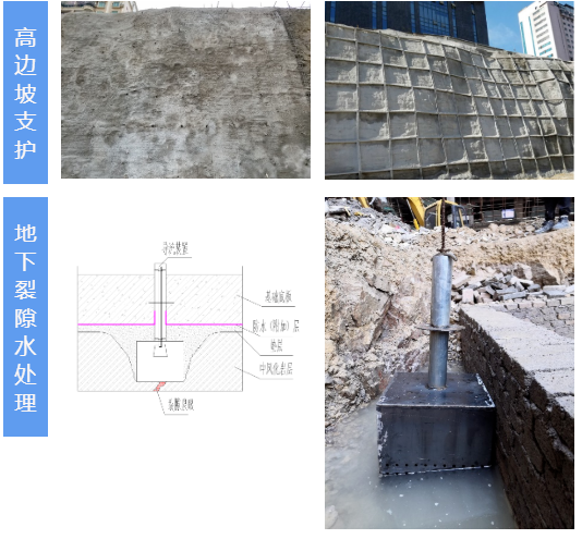 回想到施工前期,项目负责人许二猛说:“基坑安全隐患多、施工环境恶劣,边坡裸露时间长,平整度差,坡面隆起、凹陷等区域多,岩层裂隙较多且分布有大量裂隙水,多处存在潜在的滑移面及松散坡体,这近25米的:深坑真是让人头疼。”