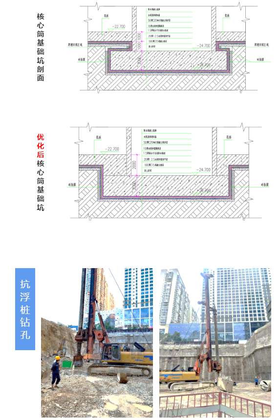 施工过程中,针对高风险的边坡施工,采用高空后补支护施工技术进行边坡支护作业,并总结经验形成高边坡后补支护施工工法;为避免人工挖孔桩工艺存在的孔桩内密闭空间作业带来的高风险性和不确定性,通过与设计、建设单位的沟通,项目将人工挖孔桩调整为施工工艺较为简单的旋挖钻孔桩,进一步保障了施工安全,也节约成本近50万元;优化了核心筒施工工艺,采用一次性浇筑方式,节约工期30余天。