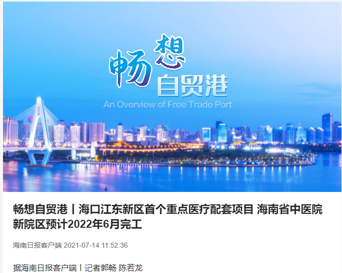 报道提到,海南省中医院新院区作为海南自贸港重点民生工程,海口江东新区首个重点医疗配套项目之一,已经进入全面冲刺阶段。
