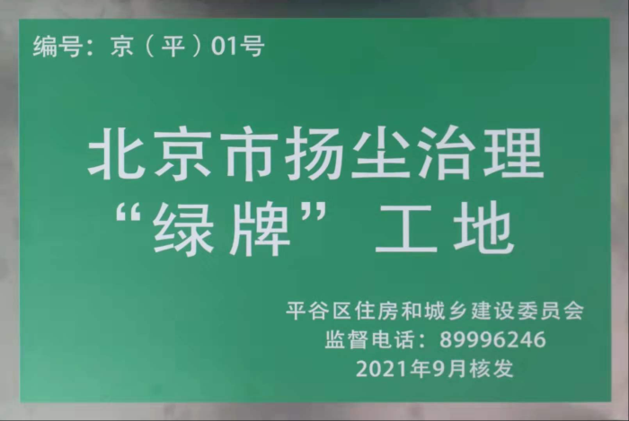 平谷区建委通过对项目现场和内页资料的检查,一致认为项目达到了北京市扬尘治理“绿牌”工地管理要求,扬尘治理“绿牌”工地检查验收圆满通过,授牌仪式顺利举行。(梁超 许鹤)