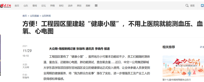 大众网报道:方便!工程园区里建起“健康小屋”,不用上医院就能测血压、血氧、心电图